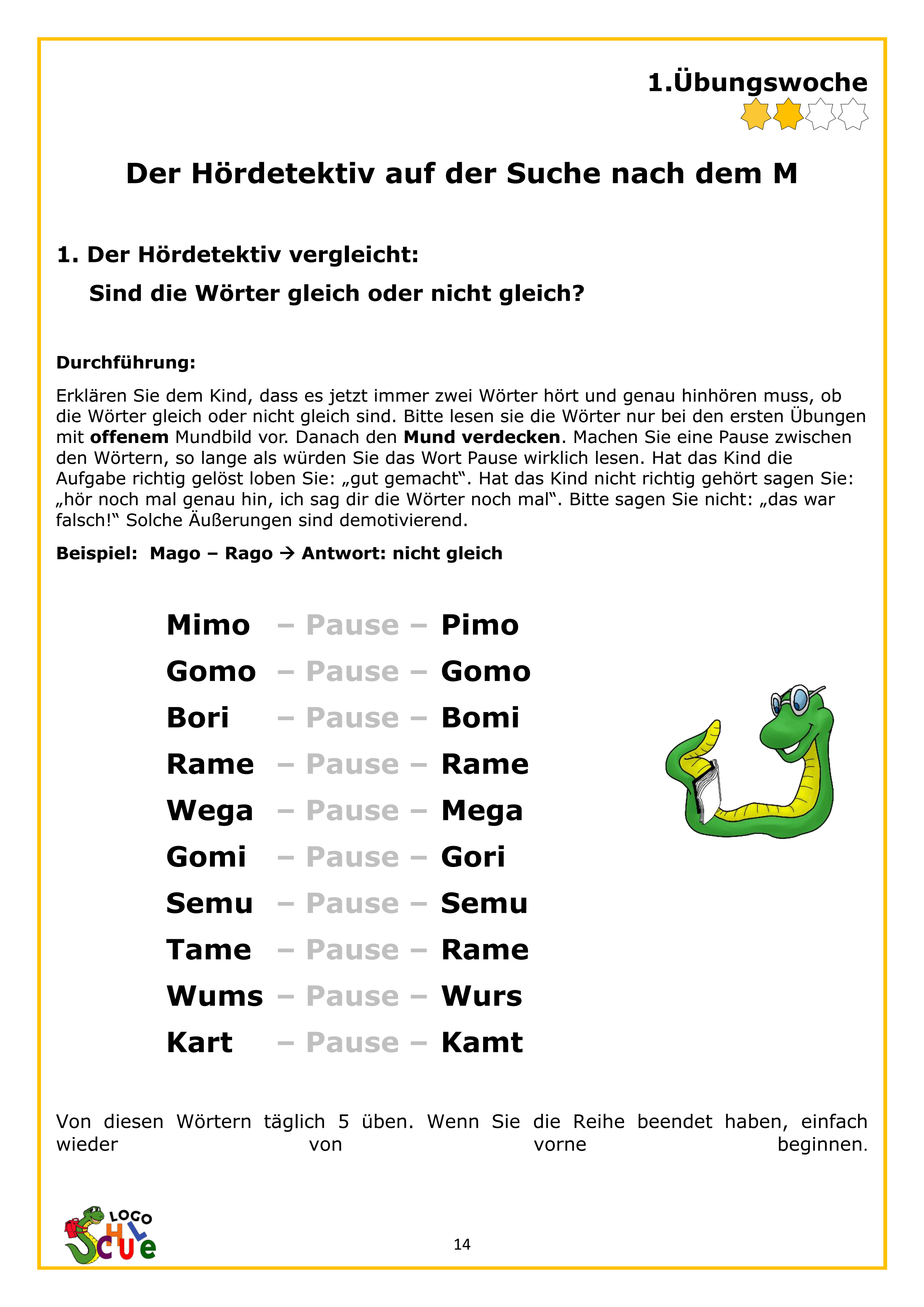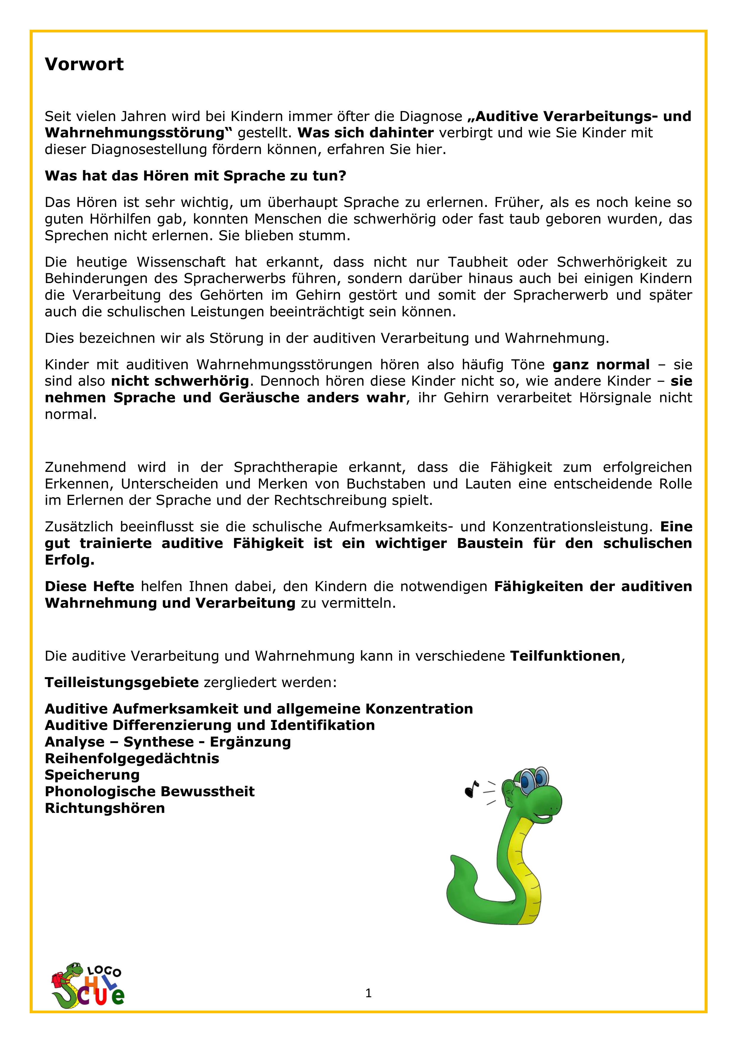 Das Übungsheft eignet sich zur gezielten Förderung der auditiven Wahrnehmung und Verarbeitung (AVWS) sowie der phonologischen Bewusstheit bei Kindern zwischen 7 und 12 Jahren.